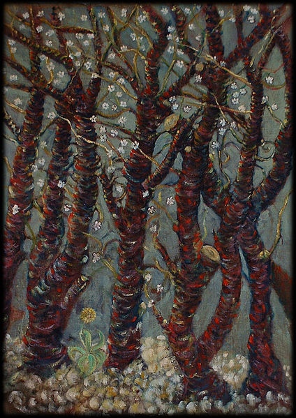 Toutes les peintures sont réalisées dans une démarche responsable . Utilisation de peinture à l’huile, tempera, résine naturelle, verjus, différents végétaux, cire d’abeille, préparation des supports par mes soins colle de peau animale ou colle de farine. . Etre fidèle au traité des préraphaélites est une vraie démarche positive pour le futur. Le support définit au départ le choix chromatique du fond, faire la différence entre un pigment pure et une couleur réalisée à partir de mélange fait toute la résonance des couleurs entre elles. Je cherche dans mon travail cette résonance, je l'appelle une eurythmie chromatique.